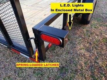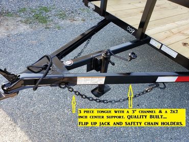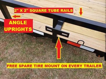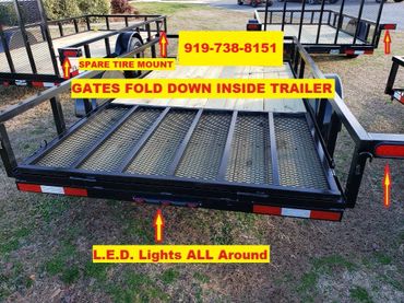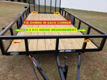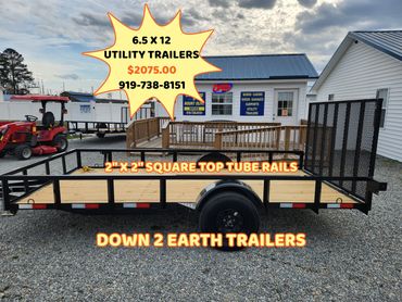 6.5X12 & 6.5X14 utility trailers (Inside measurements) * All trailers come with 2" x 2" top tube rails * 2x8 pressure treated flooring * E-Z lube hubs with grease fitting * 3500 lb. axles & leaf springs * 15 inch tires (RADIAL) * black shiny rims * Enclosed fenders with foot step * 14 inch tall rails * 4' tall gate with tube rails on 12 each center * Gates fold down inside and out * Gate hinges with grease fittings * Spring load latch pin for gate (don't have to worry about losing the pin) * 3 piece tongue and a flip up jack (requires 2" ball) * LED lights with reflector strips (license plate mount and light) * free spare tire mount *